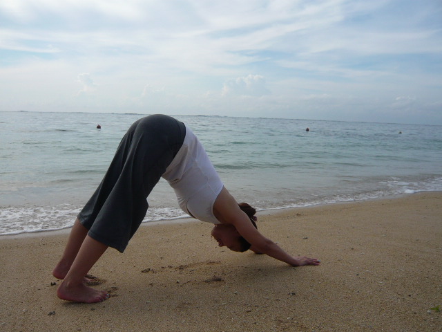 ↑ アドムカ(ダウンドッグ) 優しい砂浜に土台を、太陽にお尻を向けて!